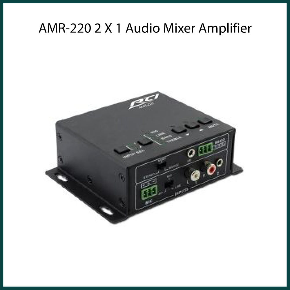 The AMR-220 is a compact-size Class-D digital mixer/amplifier for classroom or meeting room applications requiring switching of two audio sources (e.g., laptops, video conference systems). Additionally, a microphone can be mixed with the line-level audio sources. The adjustable balanced/unbalanced microphone input supports condenser, dynamic, or wireless microphones.