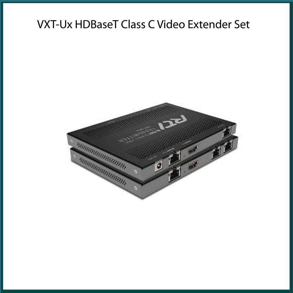 The VXT-UTx HDBaseT Transmitter delivers visually lossless HDMI 1080p video signal over a single Cat5e/6/7 cable up to 492ft (150m) and a 4K signal up to 328ft (100m) to the VXT-URx HDBaseT Receiver using Display Stream Compression. The VXT-UTx powers the VXT-URx through the Category cable using PoH (Power over HDbaseT). It also transmits an IR or RS232 signal through the same cable to control the remote display or projector.